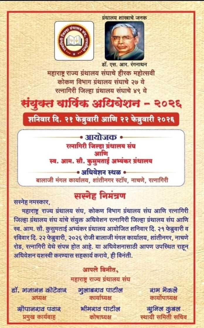 रविवारी 22 फेब्रुवारी 2026 रोजी नाशिक विभाग ग्रंथालय संघाचे अध्यक्ष डाॕ. दत्ता परदेशी यांच्या अध्यक्षस्थानी रत्नागिरीतील शताब्दी ग्रंथालय या विषयावर परिसंवाद होणार आहे तसेच दीपक पटवर्धन, मधुकर जोशी, अरुण इंगोले, गजानन जोशी, जयंत आराध्ये ,आपले मनोगत व्यक्त करणार आहेत. महाराष्ट्र राज्य ग्रंथालय संचालनालयाचे प्र.ग्रंथालय संचालक अशोक गाडेकर यांच्या मार्गदर्शनाखाली राज्यातील सर्व विभागाचे सहाय्यक ग्रंथालय संचालक प्रशांत पाटील, शालिनीताई इंगोले, डॉ. राजेश पाटील. रामदास साठे , सुनील हुसे,स.र. जोपुळे ,रत्नागिरी जिल्हा ग्रंथालय अधिकारी शशांक नाईक, ग्रंथालय निरीक्षक हेमंत काळोखे इत्यादी उपस्थित राहून मार्गदर्शन करणार आहेत.अधिवेशनाचा समारोप रत्नागिरी जिल्हा ग्रंथालय संघाचे उपाध्यक्ष संभाजी सावंत हे करणार आहेत तरी राज्यातील सर्व ग्रंथालय कर्मचारी पदाधिकारी यांनी मोठ्या संख्येने उपस्थित रहावे असे आवाहन महाराष्ट्र राज्य ग्रंथालय संघ,रत्नागिरी जिल्हा ग्रंथालय संघ ,कोकण विभाग ग्रंथालय संघ यांचे वतीने करण्यात आले आहे.